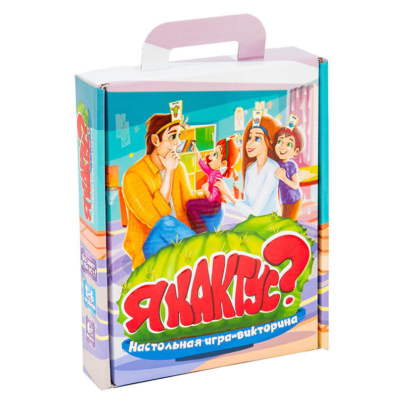 Весело провести час компанії від 2 до 6 осіб незалежно від віку допоможе настільна гра-вікторина «Я кактус?». Нагадує відому гру «крокодил» і викличе веселощі з перших кроків. Зможе зацікавити не тільки дітей, а й дорослих, дасть можливість цікаво провести час всій родині, при цьому розвинути уважність, проявити свої здібності і розважитися. Завдання гри - вгадати предмет або тварину. На початку гри кожен гравець вибирає одну картку, не знаючи, який предмет зображений на ній і зміцнює за допомогою спеціального обруча на голові. Для відліку часу відповіді на питання в комплекті є пісочний годинник. За допомогою підказок інших гравців він повинен вгадати, що зображено на його картці. Веселий сміх при цьому гарантовано! Гравець який правильно відповів на питання отримує бонусні очки, при неправильній відповіді він повинен передати хід іншому гравцеві. Правила прості, але гра захопить учасників з першої партії. Мова російська.