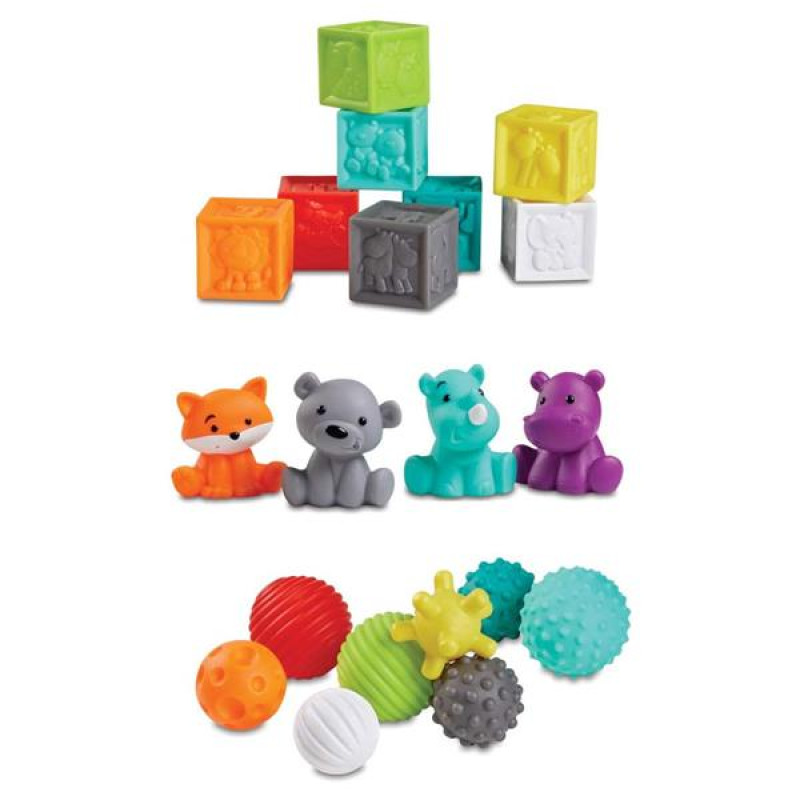 Малюки будуть у захваті від цього великого набору текстурних кубиків. Особливості: - ці фактурні блоки, м'ячики та тваринки знайомлять з цифрами, кольорами та тваринним світом, відкриваючи широкі можливості для гри; - до набору входять: 8 текстурних м'ячиків, 8 рахункових кубиків та 4 тваринки, які можна стискати. Всього 20 деталей;- ідеально підходять для маленьких рученят; - продукція виготовляється з безпечних і гіпоалергенних матеріалів, тому вона призначена для дітей перших днів життя. Складайте, стискайте або гризіть!