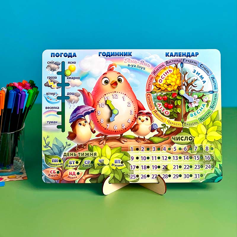 Дитячий Інтерактивний Календар "Пташка": Забавки та Навчання в Ігровій формі Розмір та зручність – ось чарівні атрибути нашого дитячого інтерактивного календаря "Пташка". Його розміри 34 х 22,5 см та яскравість роблять його ідеальним супутником в дитячій кімнаті. Головні Особливості: Легке Вивчання Часу: Рухомі стрілки на годиннику навчають маляток розрізняти години та хвилини. Пізнавання Природи: Змінювання погодних і порових індикаторів сприяє розумінню природних явищ. Розвивальний Контент: Дитина може ігровим шляхом давати імена пташці та налаштовувати годинник, стимулюючи уяву та логічне мислення. Додаткові Компоненти: У наборі ви отримаєте все необхідне для навчання та гри: календар з підставкою, а також пластикові кнопки для днів тижня та чисел місяця. Це робить навчання не тільки захопливим, а й допомагає розвивати моторику та креативність. Запрошуємо вашу дитину до світу ігор та вивчання з допомогою дитячого інтерактивного календаря "Пташка". Вчіть час та пізнавайте природу з усмішкою, завдяки цікавій та змістовній грі.
