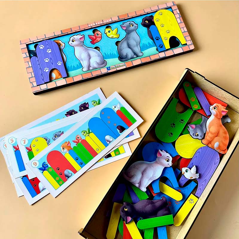 У наборі: 8 котиків, 6 пташок та 35 дощечок. Завдання дитини уважно зібрати за зразком.