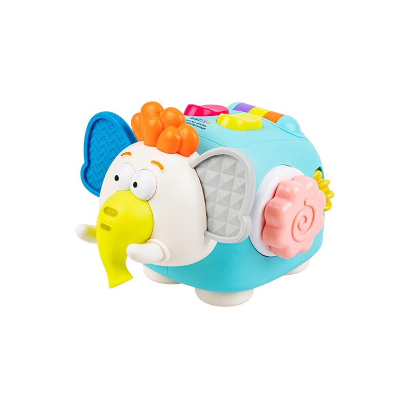 М'який слон із різноманітними поверхнями — гладкими, шершавими, пухнастими та шурхотливими — дарує нові відчуття під час кожного торкання. Контрастні елементи та тактильні вставки привертають увагу, підтримують цікавість і допомагають розвивати дрібну моторику в грі.