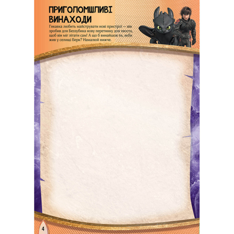 Виріжи та збери чотирьох драконів! Шукай їх всередині цієї захопливої книжки. Разом із Гикавкою та Беззубиком поринь у світ цікавих завдань, розмальовок та ігор із драконами!