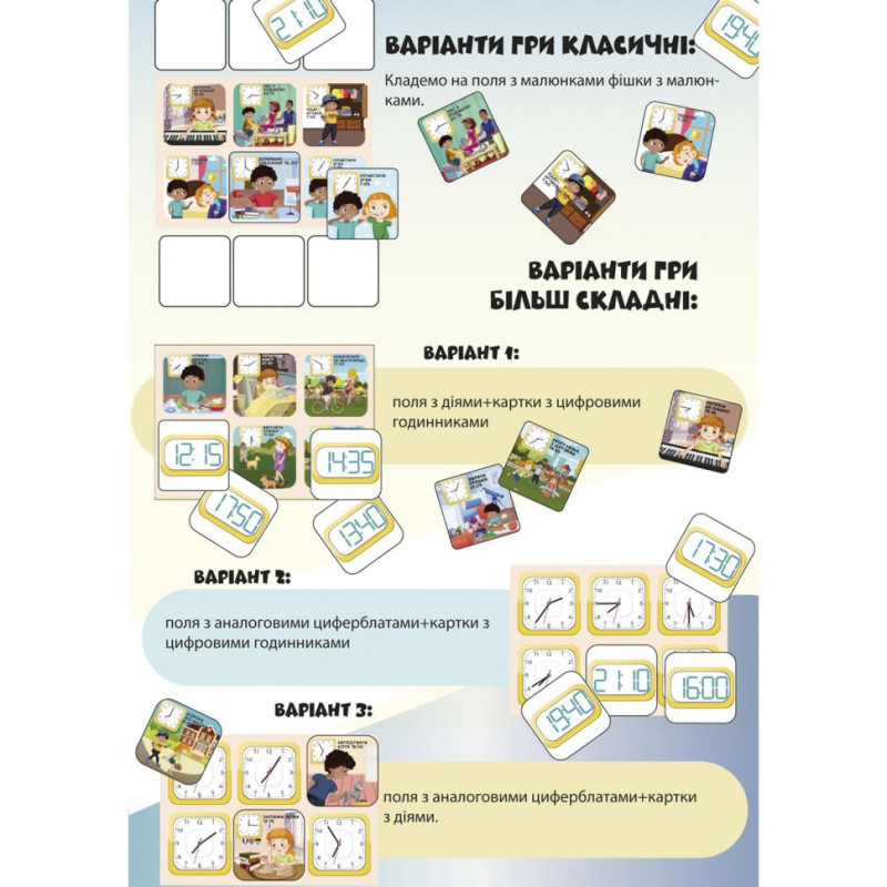 Поля та фішки містять повсякденні дії, зображення аналогових та цифрових годинників.