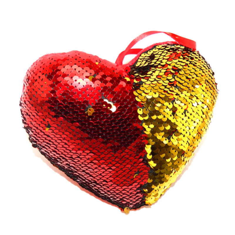 Подушка блискуча у вигляді серця прикрашена особливими двосторонніми паєтками.