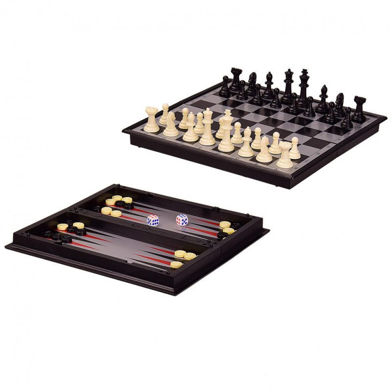 Набір з 3 ігор: шахи, шашки та нарди - вони є одними з найбільш популярних настільних ігор. Набір з двостороннім дошкою, одна сторона для шахів і шашок, а інша для гри в нарди. Такий набір зручно брати з собою в дорогу. Всередині ігрового поля зберігаються фігурки, за принципом шкатулки. Дані гри розширюють кругозір, стимулюють роботу мозку, розвивають логічне і стратегічне мислення і покращують пам'ять.