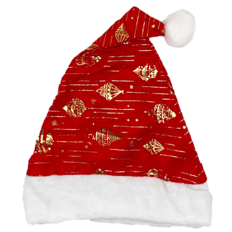 Шапка Діда Мороза з білою окантовкою виготовлена з м’якого матеріалу та прикрашена блискучими золотими візерунками, що надають виробу святкового вигляду. Червоний фон створює яскравий акцент, а пухнастий білий помпон завершує образ. Об’єм шапки 58 см, довжина 44 см — підходить для дорослих. Легка, зручна та ефектна, вона чудово доповнить новорічний образ, корпоратив або святкову фотосесію.