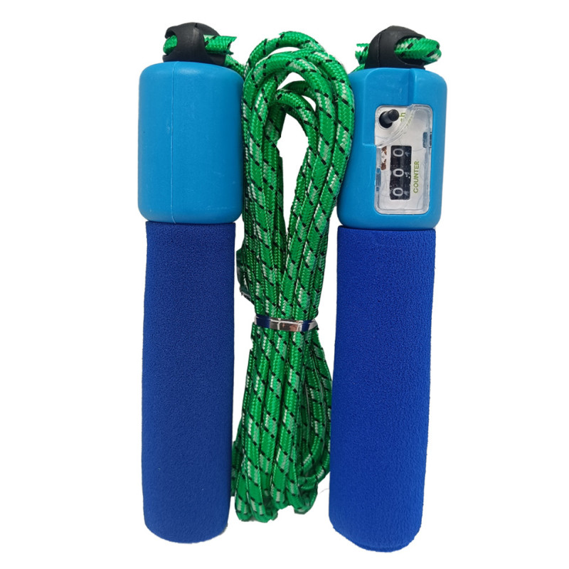 Лічильник механічний, вбудований у ручку скакалки, підраховує кількість притисків- обертів. Легко регульована довжина мотузки.