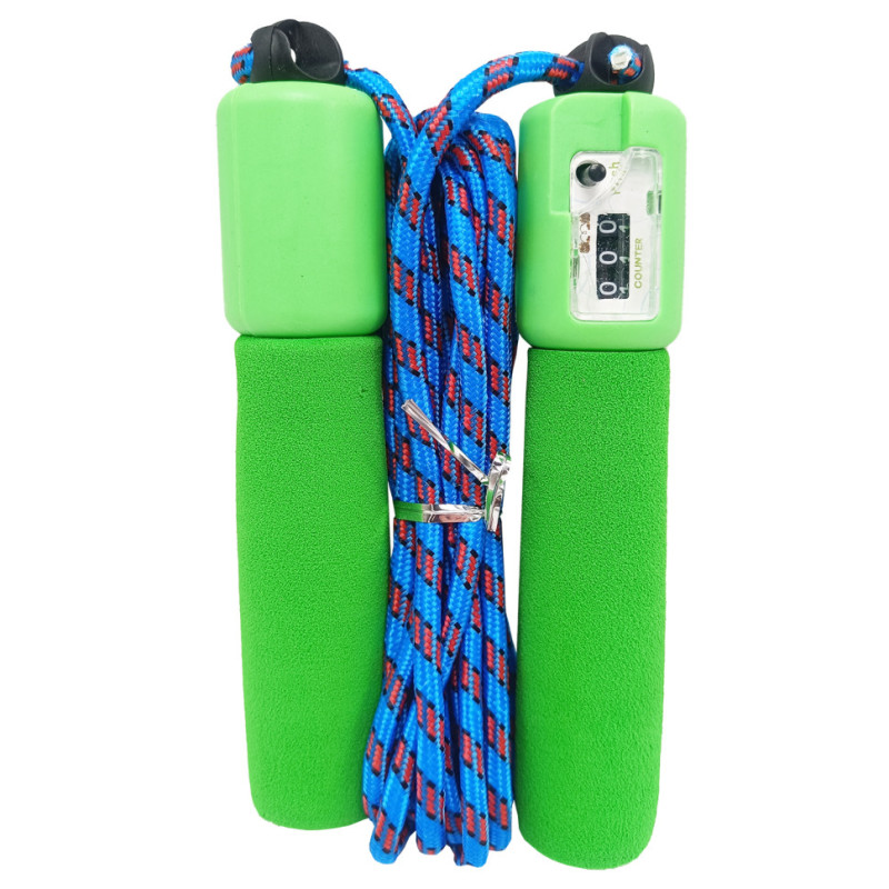 Лічильник механічний, вбудований у ручку скакалки, підраховує кількість притисків- обертів. Легко регульована довжина мотузки.