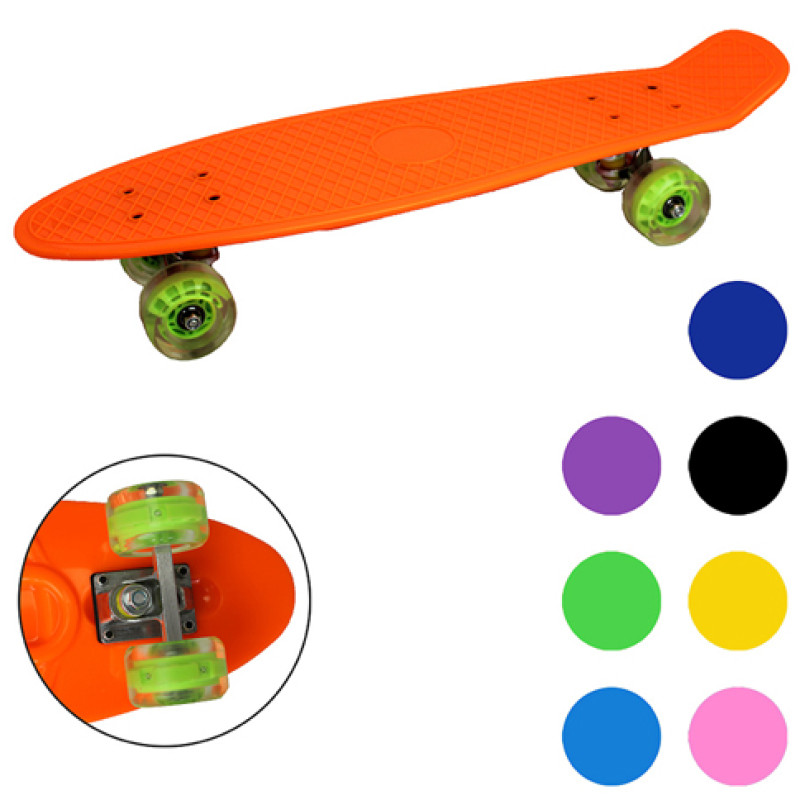 Скейт зі світловими ефектами - скейтборд помаранчевого кольору складається з пластикової дошки зі світловими ефектами і чотирьох поліуретанових коліс, а також металевої підвіски.