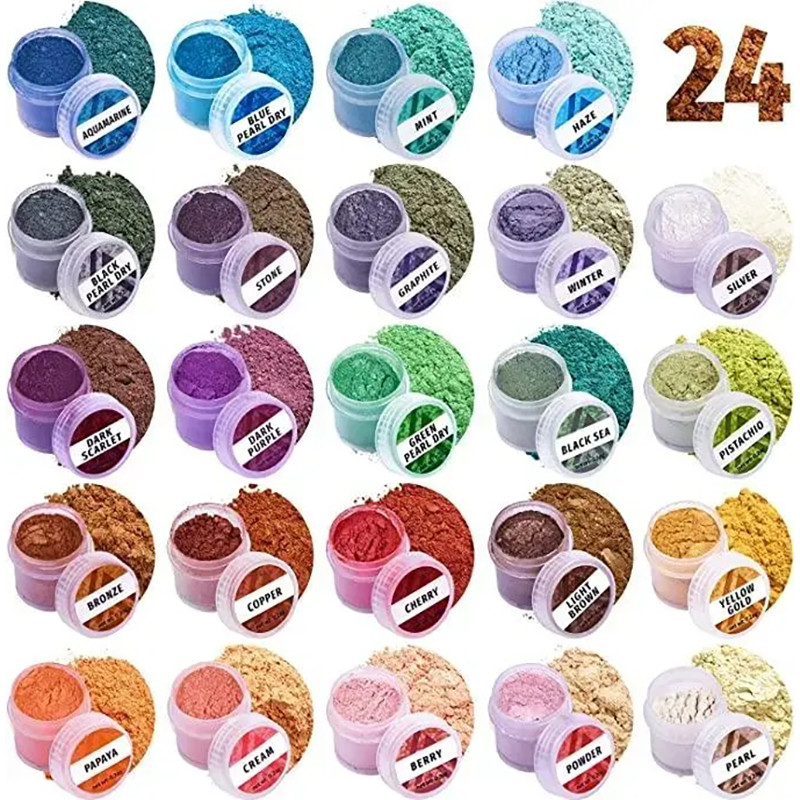 Набір з 24 баночок з пігментним порошком для епоксидної смоли: 24 баночки з порошком слюди по 0,1 унції (2,8 г) і довідковий посібник з використання вашого нового епоксидного пігментного порошку.