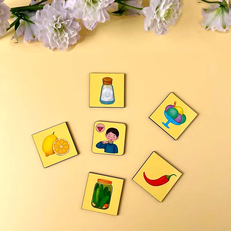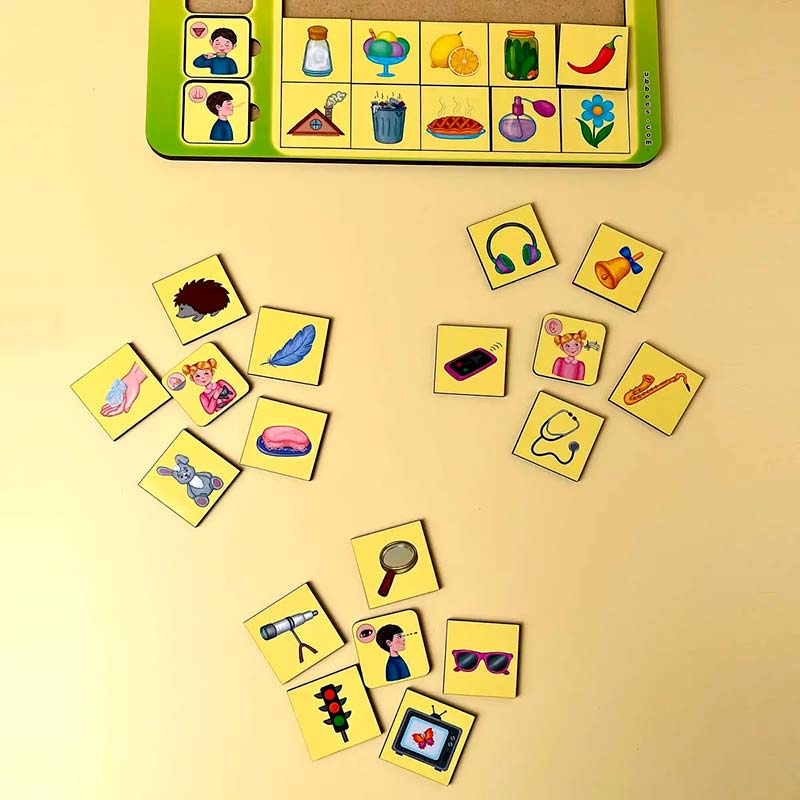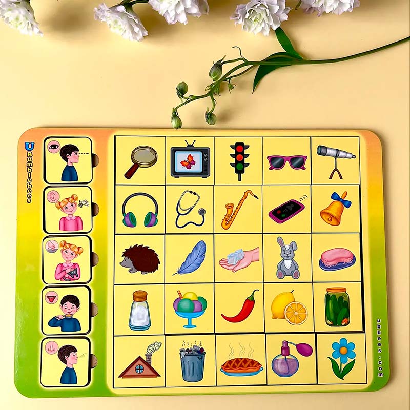 Мозок людини одержує інформацію за допомогою органів чуття. Вони повідомляють нас про те, що відбувається навколо та допомагають пізнавати світ. Наша гра допоможе мамі пояснити дитині важливість органів чуття, яскраві зображення привернуть увагу малюка і в ігровій формі сприймати інформацію буде набагато легше Матеріал гри включає 5 ігрових полів і 25 плашок для вивчення 5 почуттів людини: - зір - слух - смак - нюх - дотик Гра знайомить дітей з органами чуття людини та їх функціями. Формує поняття проте, що наші органи чуття – помічники і мають велике значення в житті людини. Розвиває мовлення, пам’ять, мислення.