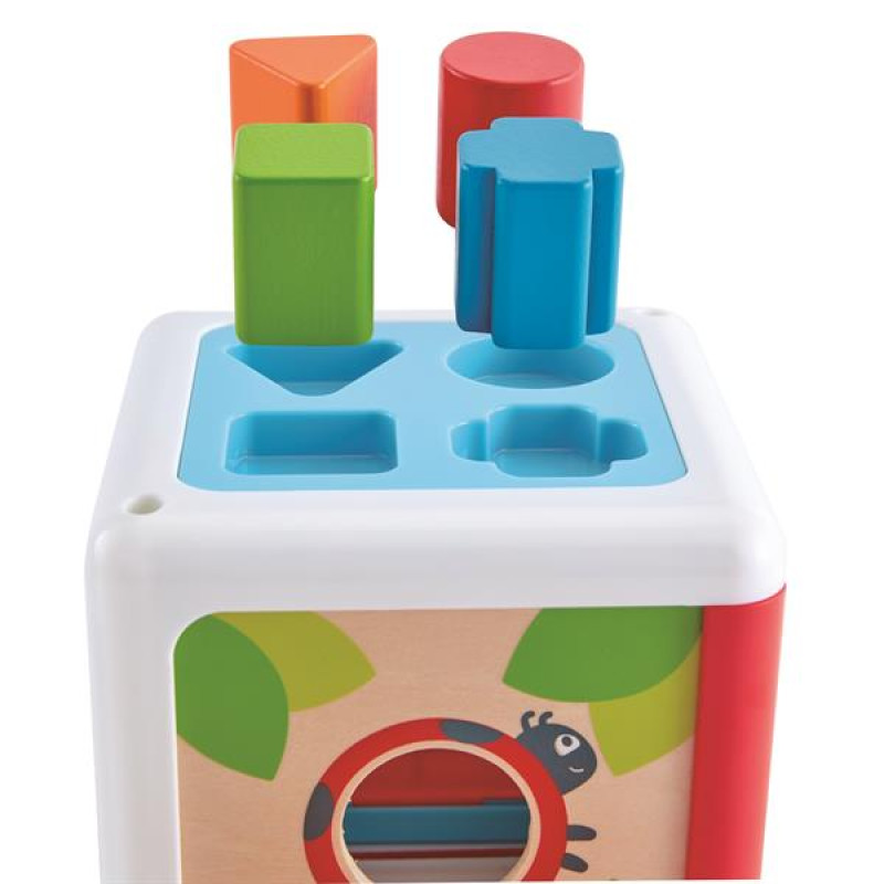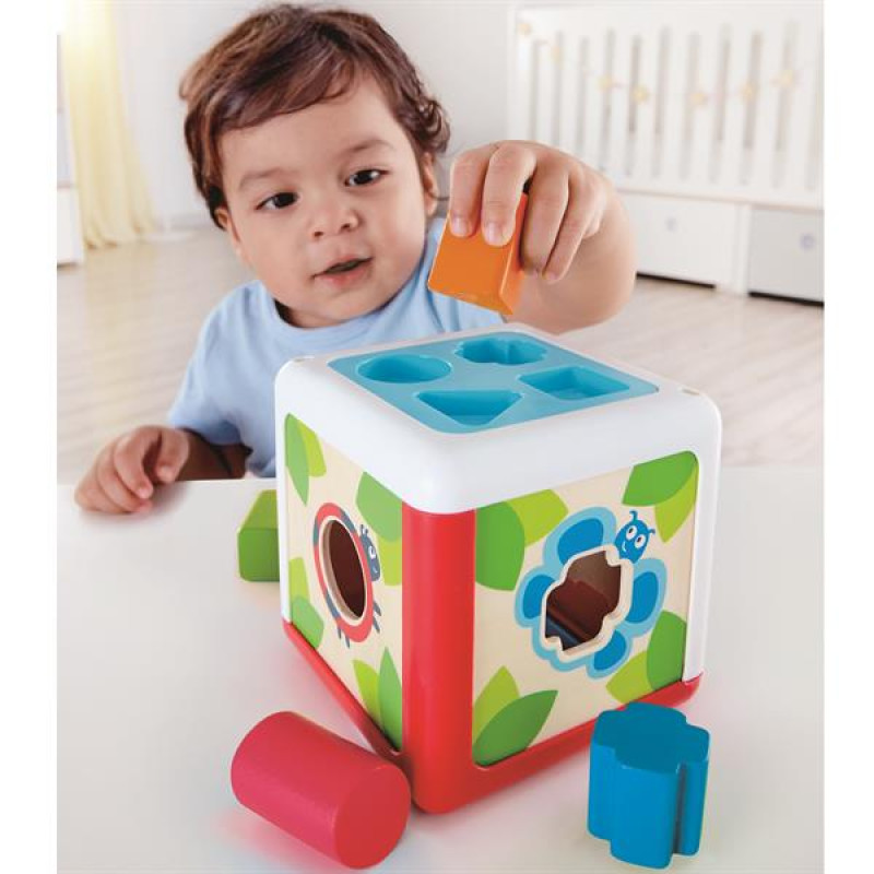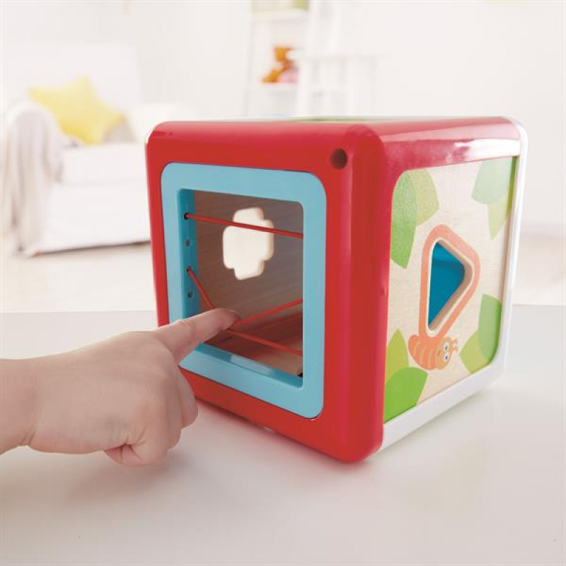 Сортер дерев'яний Hape Геометричні форми рекомендується дітям від 12 місяців.Цей барвистий бокс для сортування познайомить дітей з формами, кольорами та садовими комахами. Функціональність іграшки потішить малюка. Сторони боксу ‒ це сортер, де кожне з отворів зображує садову комаху: равлика, метелика, павука і сонечка. Верхня частина квадрата має заглиблення під фігурки.Висота квадратного боксу ‒ 13 см.Сортер дерев'яний Hape Геометричні форми (E0507) відповідає міжнародним стандартам якості EN 71 і ASTM F963.