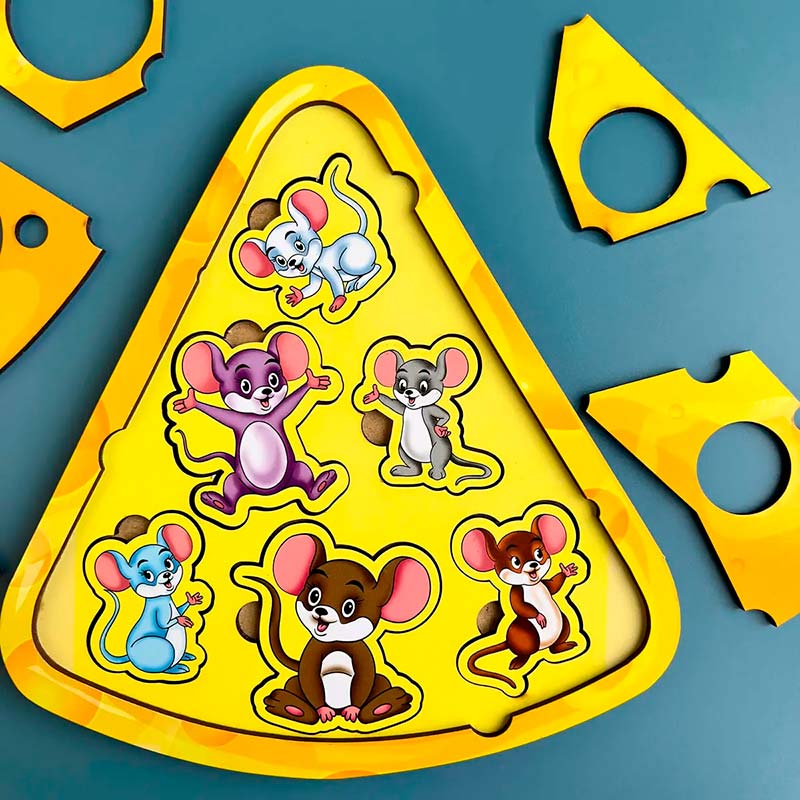Двошарова дерев'яна головоломка. Усі деталі дуже зручно діставати пальчиками. Верхній шар - це шматочки сиру різної форми, а під ними шар з мишками-вкладишами, які визирають через сирні дірки. Порахуйте мишок і знайдіть кожній своє місце. Запропонуйте дитині знайти найменшу і найбільшу мишку (вивчення "більше-менше"). Зберіть пазл зі шматочків сиру і порахуйте в ньому усі дірочки. Придумайте цікаву історію про "Сирний будиночок" і його жителів.