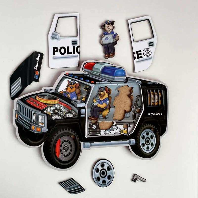 У наборі 25 деталей. Двошаровий пазл. Собачки-поліцейські поспішають зловити всіх злочинців на великій та гарній поліцейській машині.