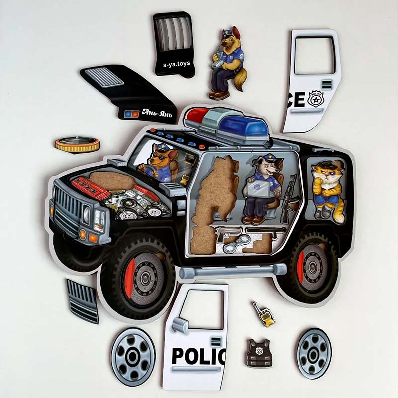 У наборі 25 деталей. Двошаровий пазл. Собачки-поліцейські поспішають зловити всіх злочинців на великій та гарній поліцейській машині.