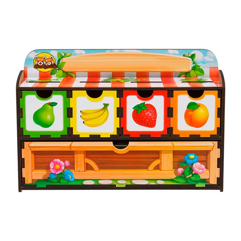 Чарівна скринька для навчання дитини рахунку і кольорам. У наборі йдуть 7 планок з різною кількістю вкладишів овочів і фруктів: банан, абрикос, груша, полуниця, гарбуз, огірок, помідор, кукурудза, які необхідно правильно вкласти в 4 двосторонніх скриньки (малюнок з двох сторін) за кольором і тематичним зображенням.