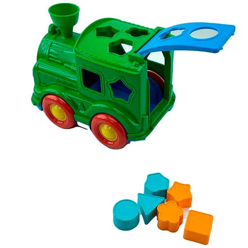 На корпусі паровозика розташовані фігурні отвори, у які потрібно вставляти відповідні за формою елементи. Такий процес сприяє розвитку логічного мислення, посидючості та координації рухів.