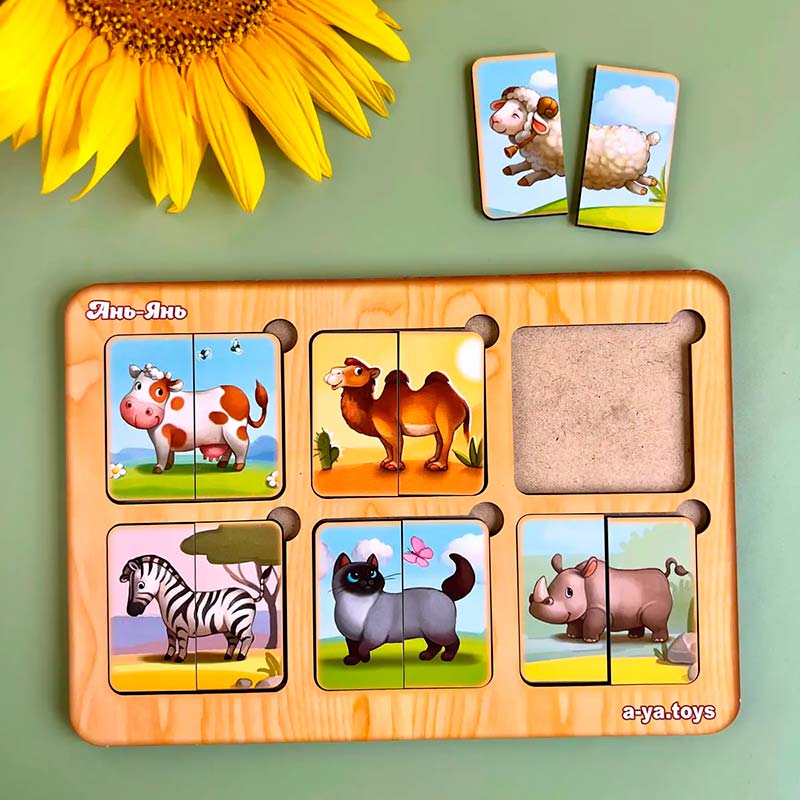 У наборі 6 картинок тварин, які розділені навпіл. Необхідно знайти свою половинку або ж пофантазувати і створити не "зебру", а, наприклад, "кото-зебру". Порахуйте тварин та розкажіть дитині, де вони живуть, що їдять і які звуки властиві саме їм. Деталі легко діставати пальчиками.