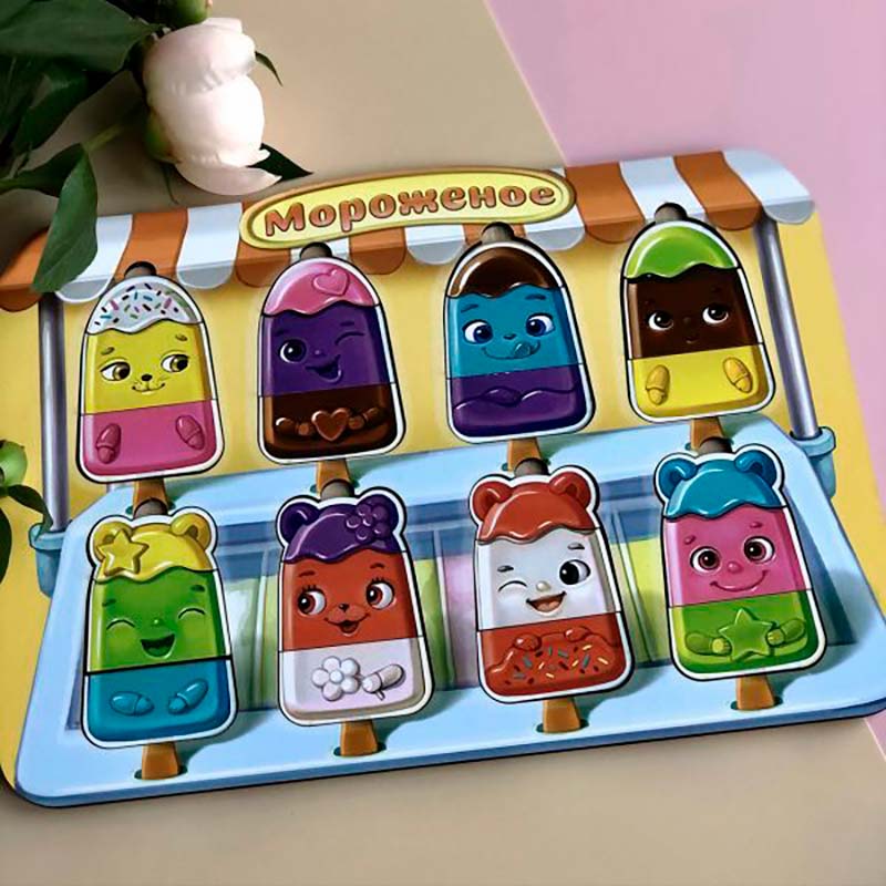 Сортер з 8 морозив різного кольору (4 з вушками і 4 без). Кожне морозиво розділене на три частини, усі вони взаємозамінні і можна зібрати своє різнобарвне морозиво. Також можна збирати морозиво, орієнтуючись на прикраси, які ми заховали на різних частинах морозива: сердечко, зірочка, квіточка або присипка. Усі детальки легко діставати пальчиком.