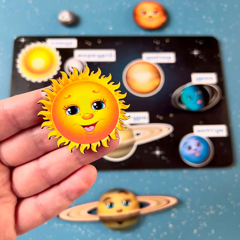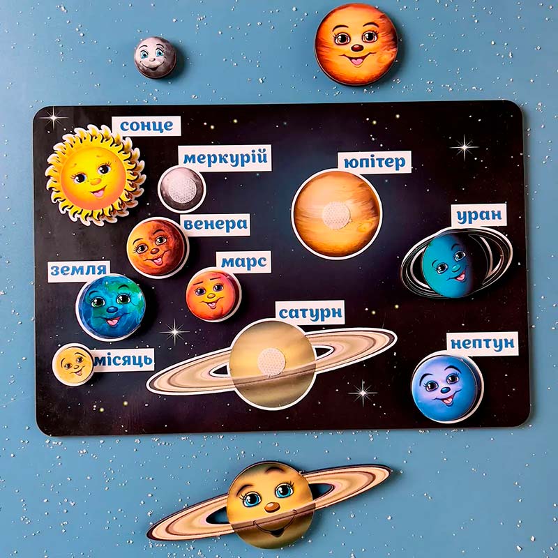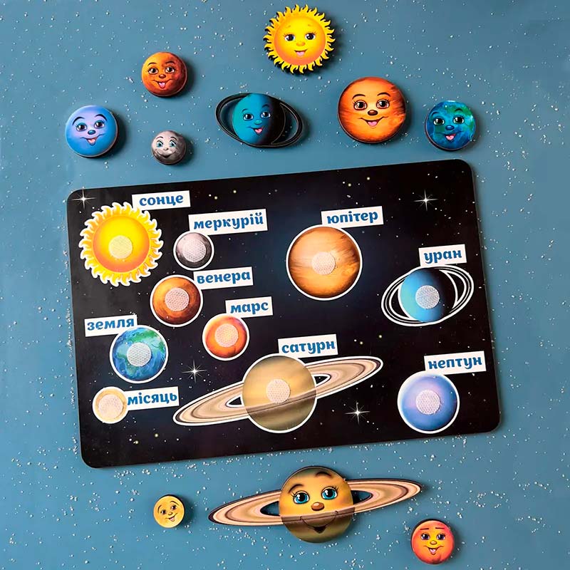 Космос стане ближче разом з нашою iграшкою. Розкажiть дитинi, якi планети знаходяться у сонячнiй системі. Навчайтеся, граючись: лiпіть ті планетки, що дитина вивчила. Розкажiть, яка найбiльша та найменша з планет. Спитайте якого кольору кожна, порахуйте скiльки iх.