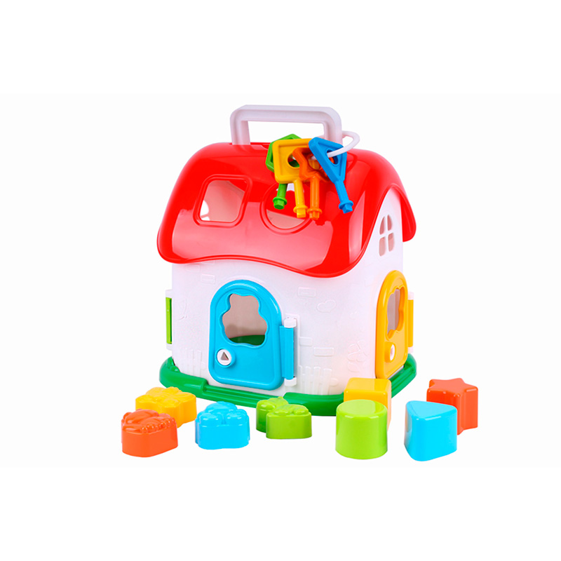 Іграшка "Будиночок" - це велика хатинка з 4-ма дверима під червоним дахом. Через фігурні отвори у дверях в середину можна проштовхнути фігурки звірів: жабки, коника, ведмедика та метелика. А щоб дістати звіряток, необхідно відкрити дверцята відповідним ключем. Для допомоги малюкам кольорові підказки – фігурки звіряток, дверей та ключиків співпадають по кольору. Форма ключика також не випадкова і відповідає замочку на конкретних дверях: квадрат, трикутник, ромб та зірка. Через отвори у даху також можна проштовхнути формочки геометричних фігур. Ці формочки спеціально спроектовані для правильного навчання - вони високі, і їх не можна проштовхнути боком, або у невірний отвір.