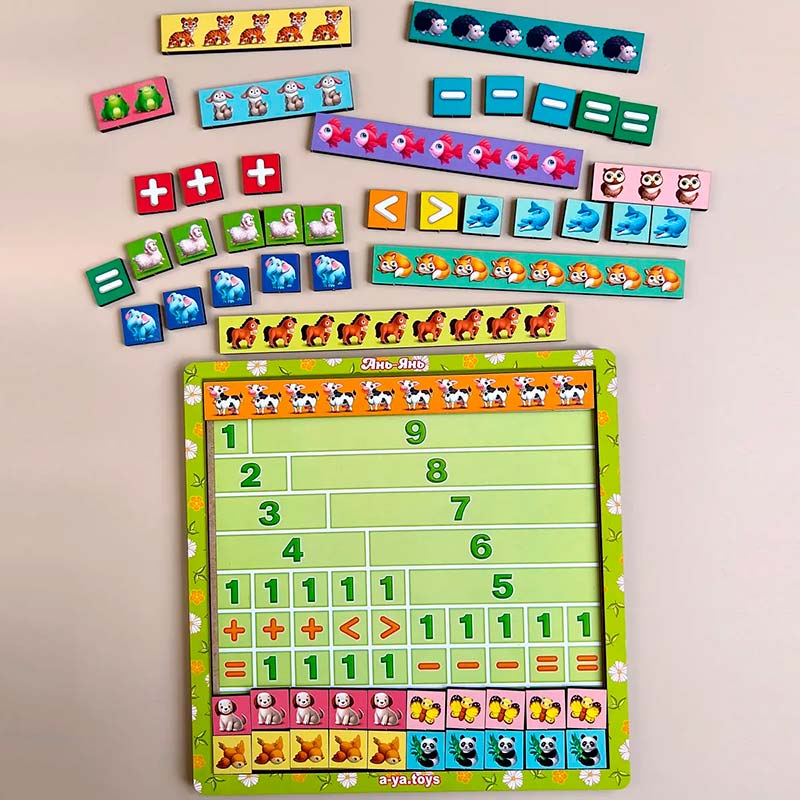 Математичні сходинки - це набір лічильного матеріалу: лінійки із зображенням тварин від 1 до 10, а також математичні знаки: +; -; =; . Ця гра допоможе дитині вивчити цифри, співвідношення числа і кількості, прямий і зворотній рахунок, склад числа, поняття "більше" і "менше", "більше на ...". Викладіть поряд 2 лінійки, наприклад, з числами 5 і 2 та поясніть дитині, що 5 більше, ніж 2 на 3 одиниці і покладіть 3 плашки одинички. Навчіть ділити ціле на частини і вимірювати предмети мірками, наприклад число 6=6 плашок по 1 зображенню. Поясніть склад числа, наприклад, числа 7=6+1, 7=5+2, 7=4+3. Такі вправи відмінно підходять для вивчення прикладів додавання і віднімання. Приємних і корисних вам занять!