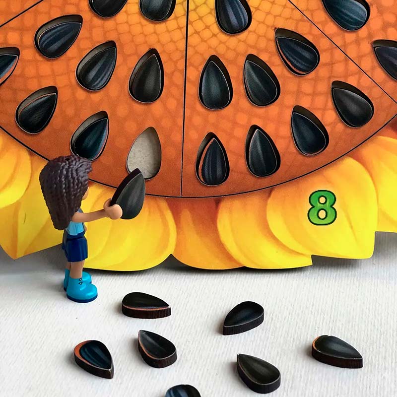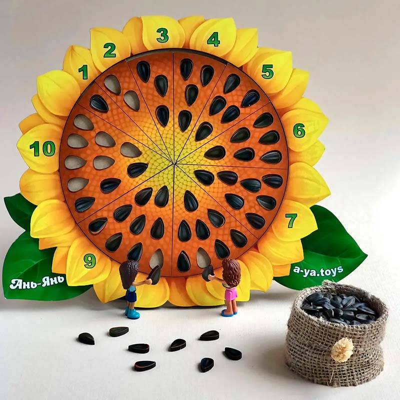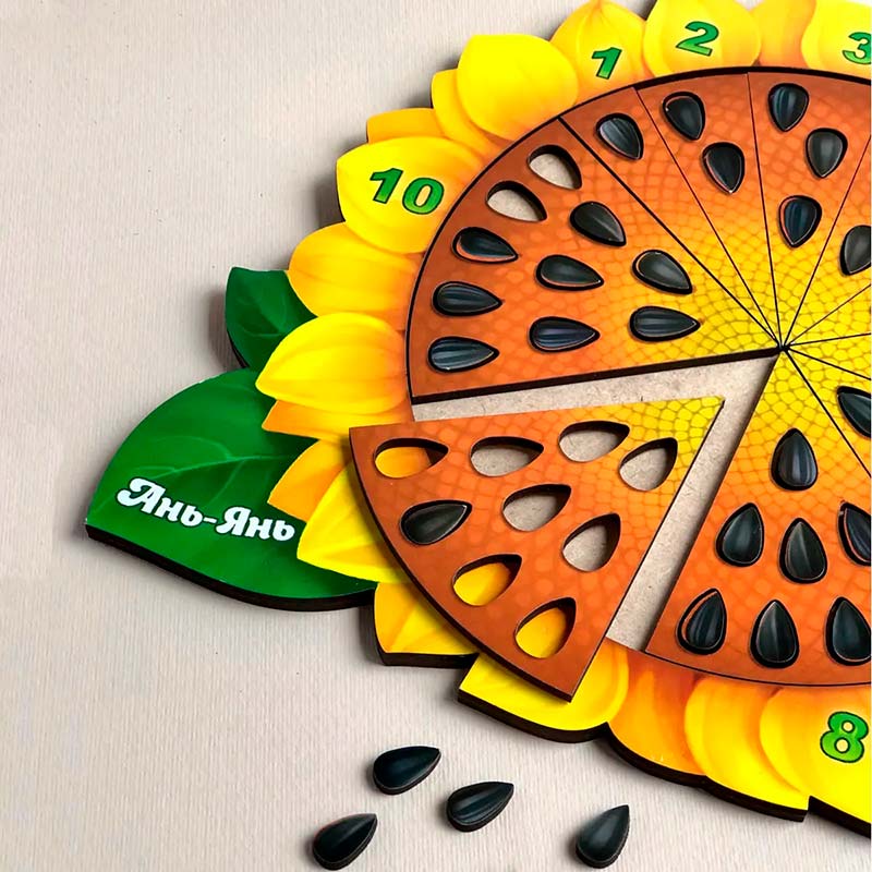 За допомогою такого кольорового математичного соняшнику можна легко вивчити з дитиною цифри і навчити її рахувати. Гра також підходить для вивчення дробів та допомагає в ігровій формі зрозуміти і побачити, що таке "частина і ціле". Насіння - це відмінний рахунковий і сортувальний матеріал.