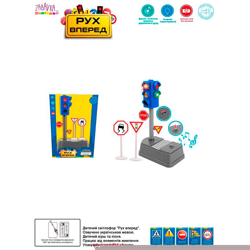 - Ефекти: Світлофор оснащений звуковими та світловими сигналами, які імітують справжню роботу світлофора.