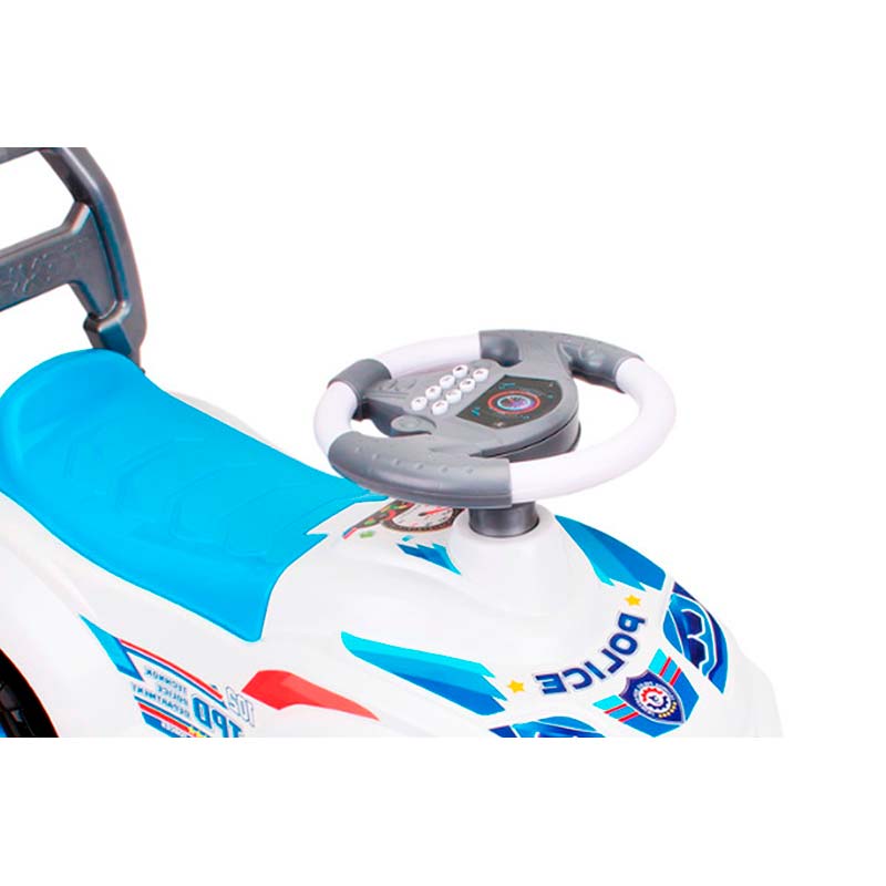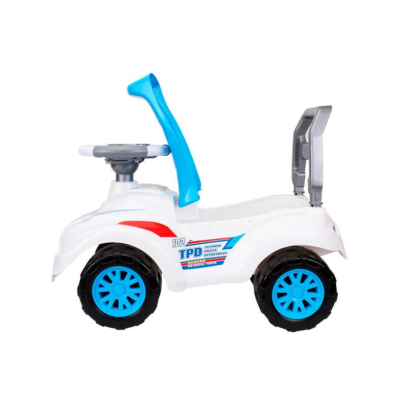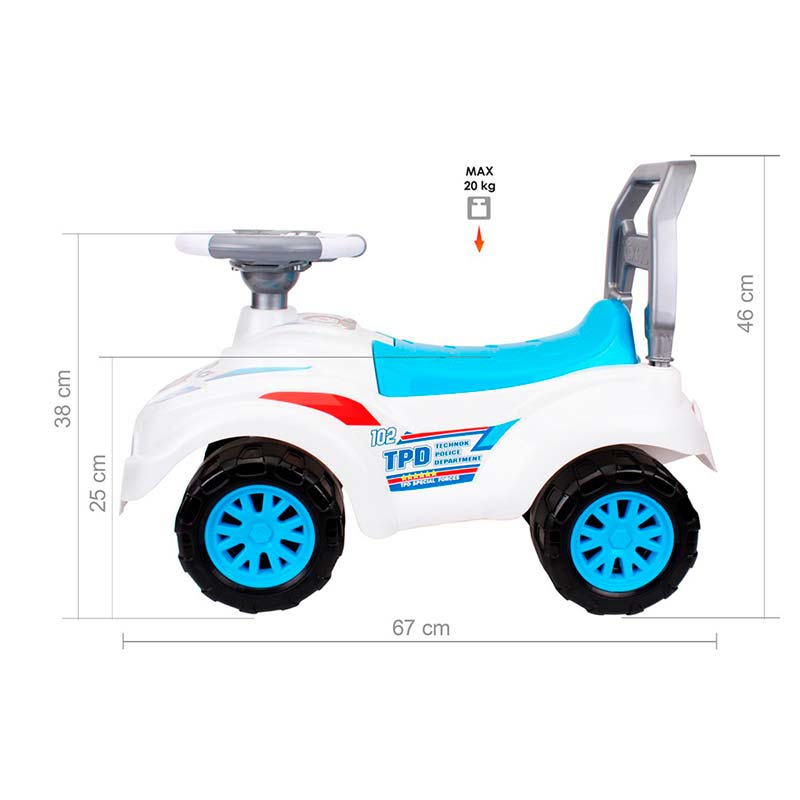 «Автомобіль для прогулянок ТехноК» має яскраві кольори, "круті" наліпки, ергономічний дизайн, захопливі звуки та сигнали, які неодмінно привернуть увагу малечі до іграшки. А нове електронне кермо принесе море радості Вашим малюкам під час катання на автомобілі. Вісім кнопок – це вісім різноманітних сигналів: запуск двигуна, різке гальмування, екстрені служби поліції, швидкої та пожежної допомоги, попереджувальний «фа-фа» і весела музика. Автомобіль надійний, міцний, практичний та зручний. Для перевезення всіх необхідних речей розроблено великий багажний відсік під сидінням .