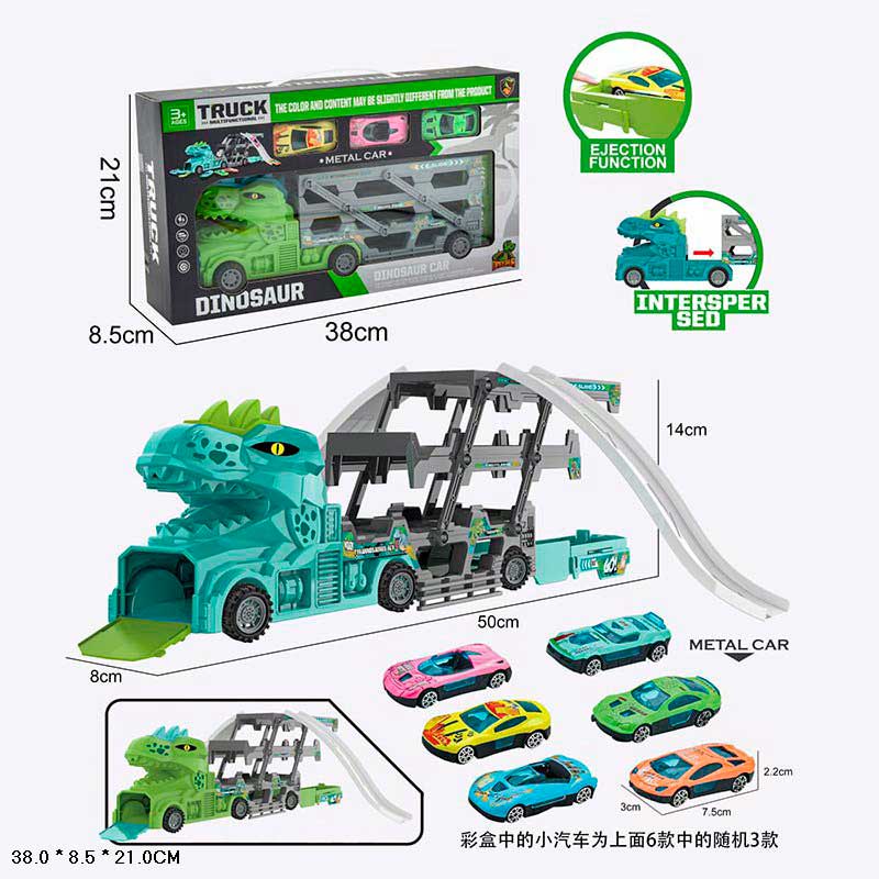 Насолоджуйтеся веселими моментами гри, вирушаючи в захоплюючі пригоди з трейлером у формі динозавра та його яскравими машинками!
