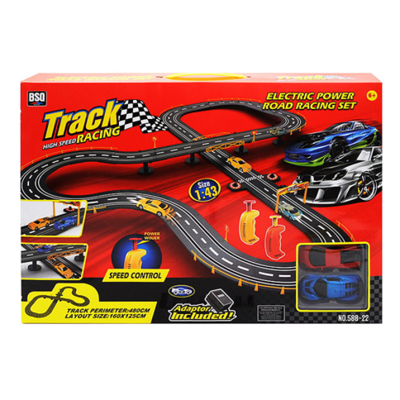 Трек довжина траси 480 см - трек електричний, з містком і крутими поворотами. Довжина шляхів - 480 см. Пульти керування під'єднуються до треку, машини рухаються магнітними рейками.