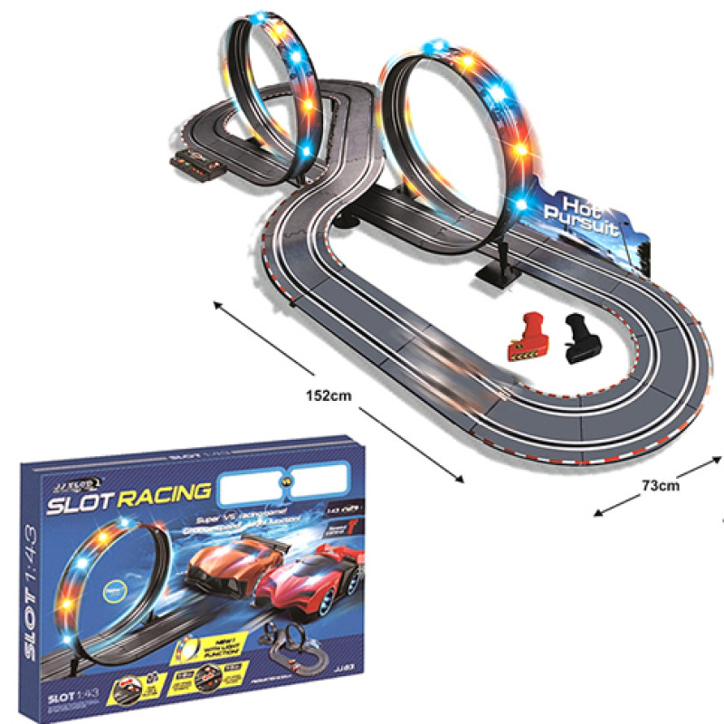 У наборі: 2 машини, масштабом 1:43, 2 регулятори швидкості, деталі для встановлення траси.