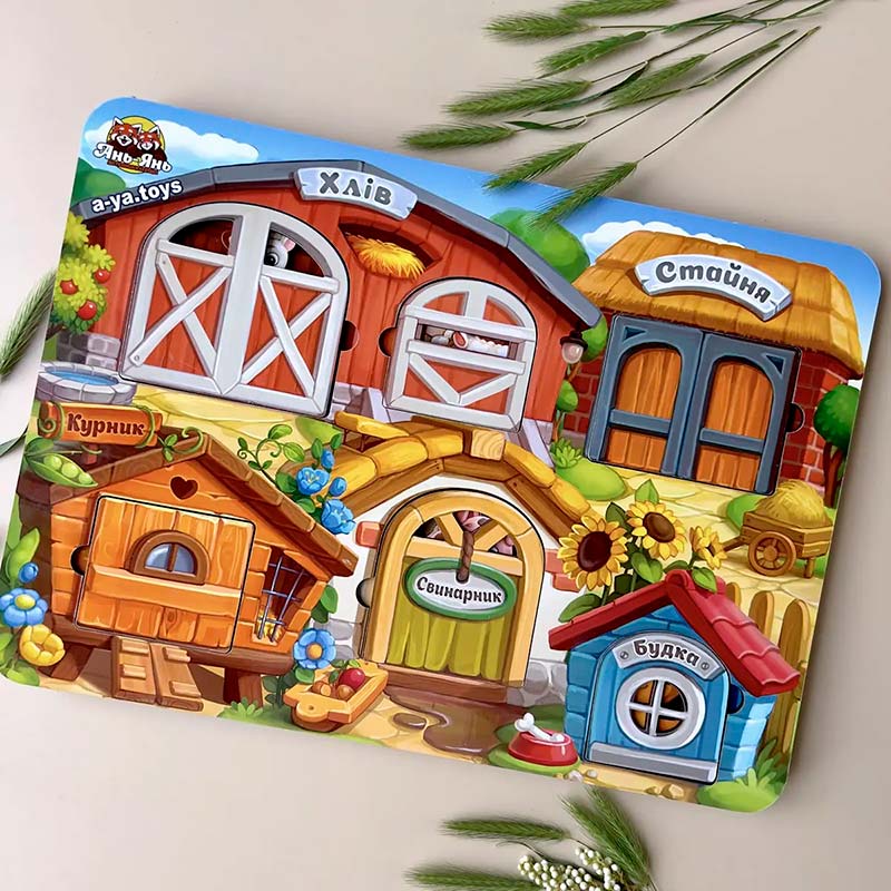 Вкладиш "Ферма" - це 6 родин різних тварин, які живуть на фермі. Необхідно знайти кожній родині її тематичний будиночок-вкладиш. Усі будиночки з індивідуальним дизайном як зовні, так і всередині - це як підказка для дитини, щоб знайти будиночки для усіх тварин. Вивчайте поняття "великий і маленький", рахуйте тварин. Усі вкладиші зручно діставати пальчиками.