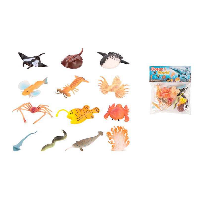 Набір включає різноманітних морських жителів, таких як риби, восьминоги, морські зірки та інші мешканці океану. Кожна фігурка виконана з безпечних та якісних матеріалів, що забезпечує довговічність і безпеку під час гри.
