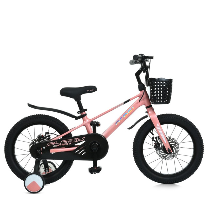 Велосипед дитячий Profi 16 дюймів Flash MB 1683 - поєднує в собі високу якість, надійність і комфорт, кататися на такому велосипеді легко і безпечно, в комплекті є додаткові бічні коліщатка, які допоможуть утримувати рівновагу.