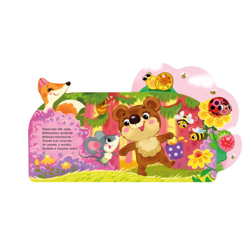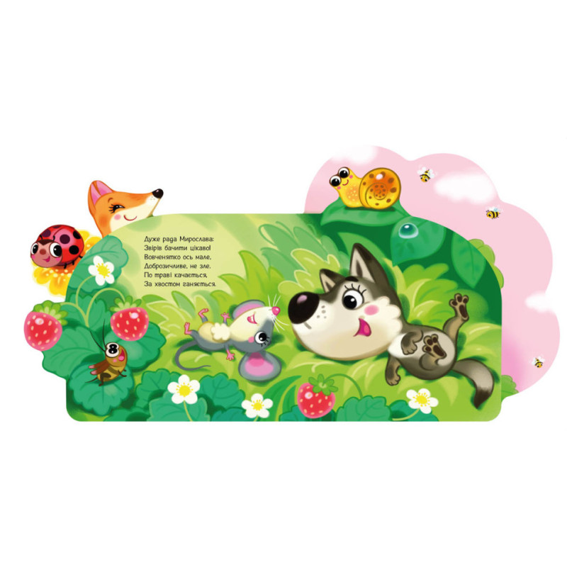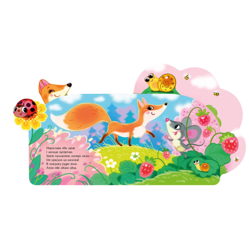 Ця книжечка ― про цікаву лісову прогулянку мишки Мирослави, яка зустрічає у лісі нових друзів ― зайчика, ведмедика, лисичку, вовченя і білочку. Кумедні малюнки та оригінальна форма книжки розважать малюка, а веселі доладні віршики він, можливо, схоче вивчити напам'ять.