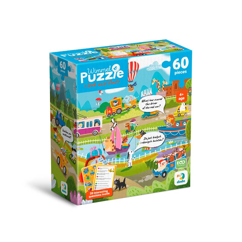 Що робити, якщо набридло ходити пішки? Обрати для себе транспортний засіб... Але який? Визначитися вашому малюкові допоможе наш вімель пазл, адже на ньому зображені, мабуть, усі існуючі варіанти транспорту: від повітряної кулі до земних роликів. На зображенні так багато транспорту та водіїв, що полічити їх здається викликом. А у вас вийде? Особливість вімель пазлу — кількість елементів на зображенні, адже пазл буквально кишить персонажами. Задача дитини — знайти потрібний елемент, який зазначений на картці із завданнями. Гра з таким пазлом вчить малечу кмітливості та концентрації уваги.
