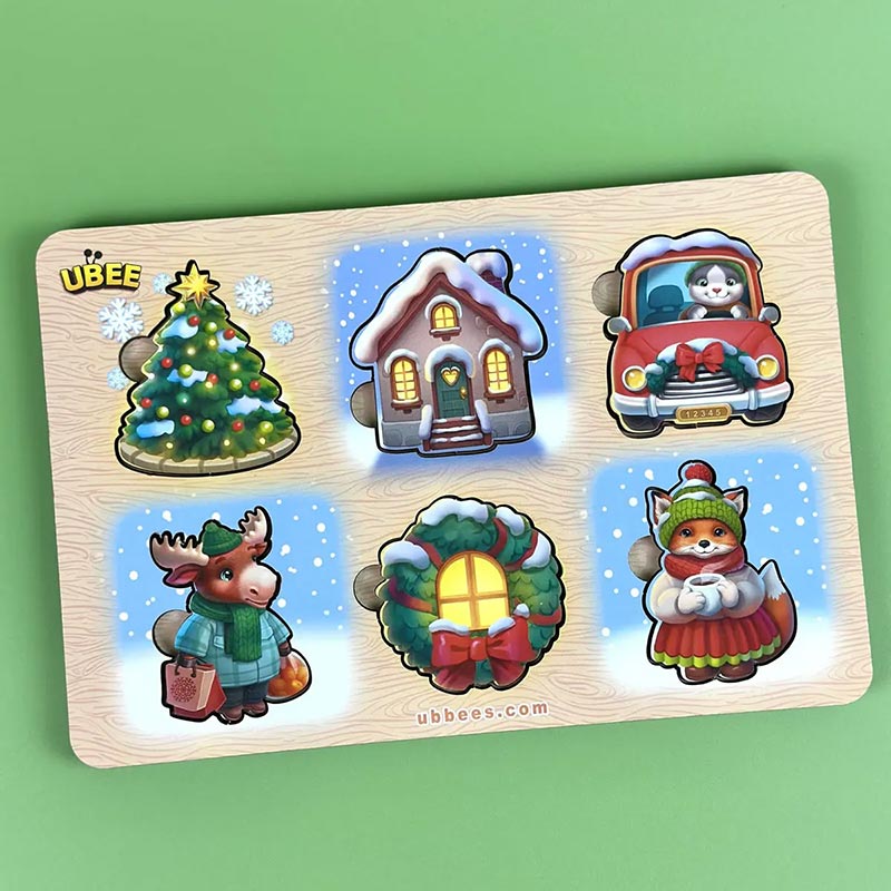 Весела сцена з котиком у машині, прикрашеною ялинкою, та оленятком із подарунками запрошує малюка знайти місце для кожної фігурки на зимовому тлі. Гра дарує перше відчуття успіху, коли дитина самостійно поміщає зображення на своє місце.